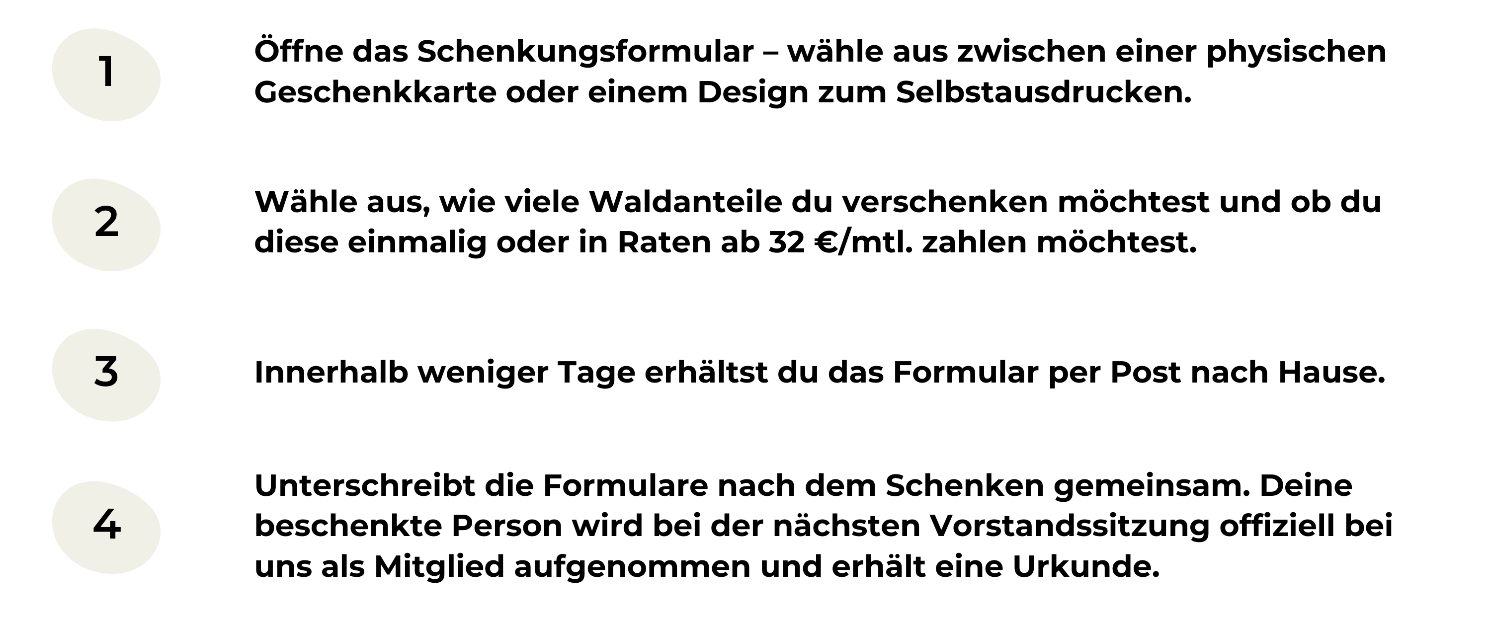 Heute mitzumachen und Veränderungen sofort zu gestalten, geht bei uns schon mit kleinen Beträgen ab 32 € im Monat. Wir bieten verschiedene Zahlungsmodelle an, um den Kauf von Genossenschaftsanteilen auch mit geringen Ersparnissen zu ermöglichen. Der Finanzierung eines Anteils auf Raten kann aber auch aus Finanzplanungssicht interessant sein, da so die anfänglichen Kosten geringer sind und die Rate für die nächsten Monate in der gewünschten Höhe eingerechnet werden können. Du kannst Waldanteile per einmaliger Zahlung zahlen oder per Raten, die du über 1, 2 oder 4 Jahre strecken kannst.